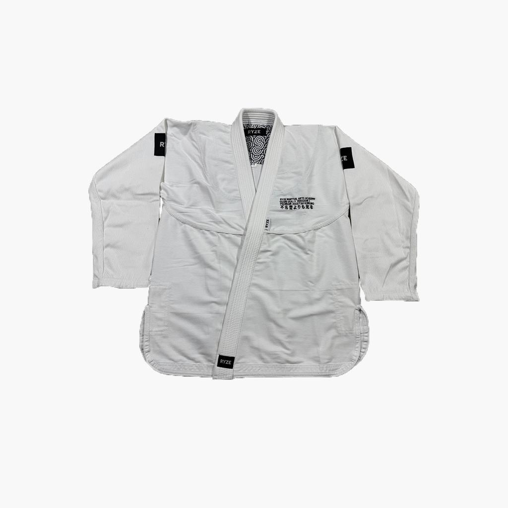 KIMONO DETAILS PEARL WEAVE // 450 GSM ROUNDED CUT GI SKIRT// 10 OZ COTTON TWILL PANTS WOVEN CUSTOM PATTERN ON INSIDE OF KIMONO RYZE WOVEN LABEL ON SHOULDERS// EVA FOAM COLLAR EMBROIDERED LOGO ON FRONT CENTER WOVEN LABEL PATCH ON BACK OF KIMONO 6 POINT LOOP SYSTEM ADULT AND YOUTH SIZES